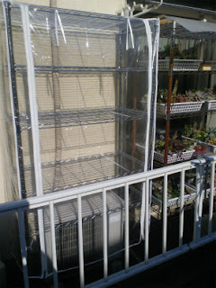 一応まだ使ってない方の棚には簡易温室用のビニールを被せてあります^^ ホームセンターで、計ったようにピッタリなサイズを見つけましたよ! 縦の尺はちょいと足りてませんが、無いよりましでしょう^^;